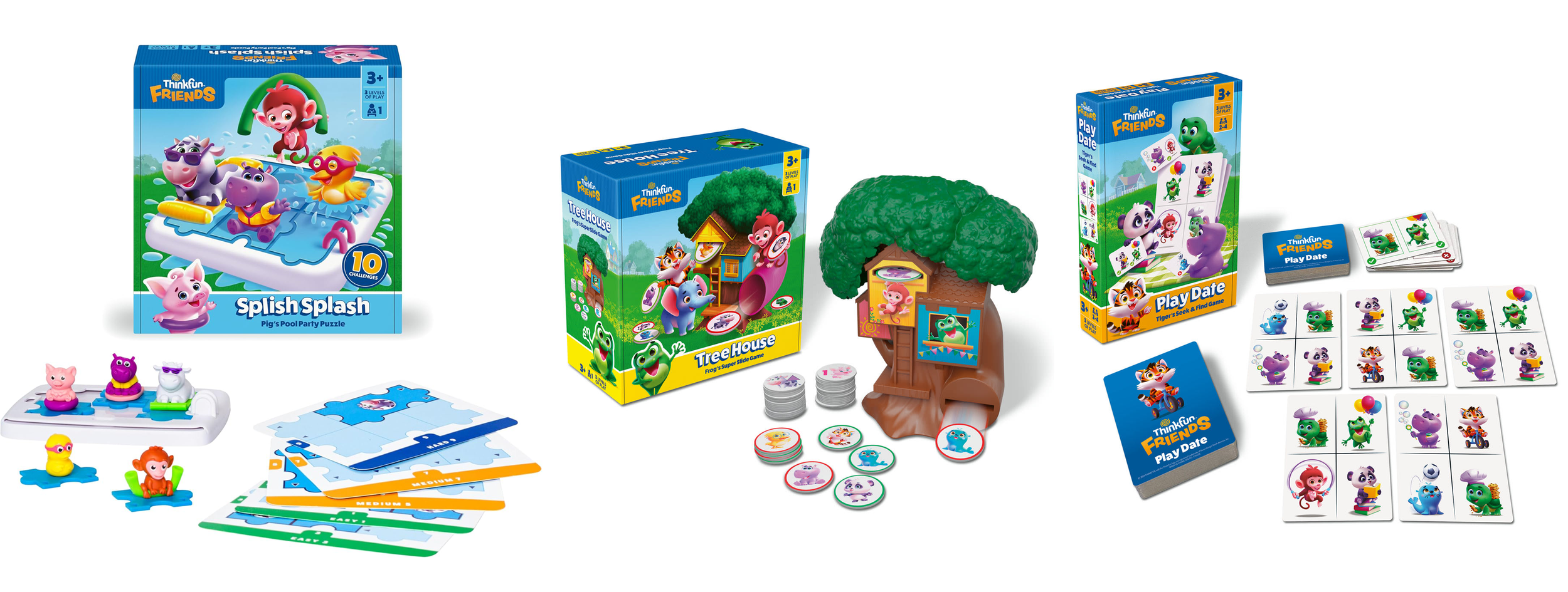 ThinkFun Friends board games: Splish Splash, TreeHouse, and Play Date. The collection demonstrates the final illustrations as printed on the physical game boxes, cards, and other components.
