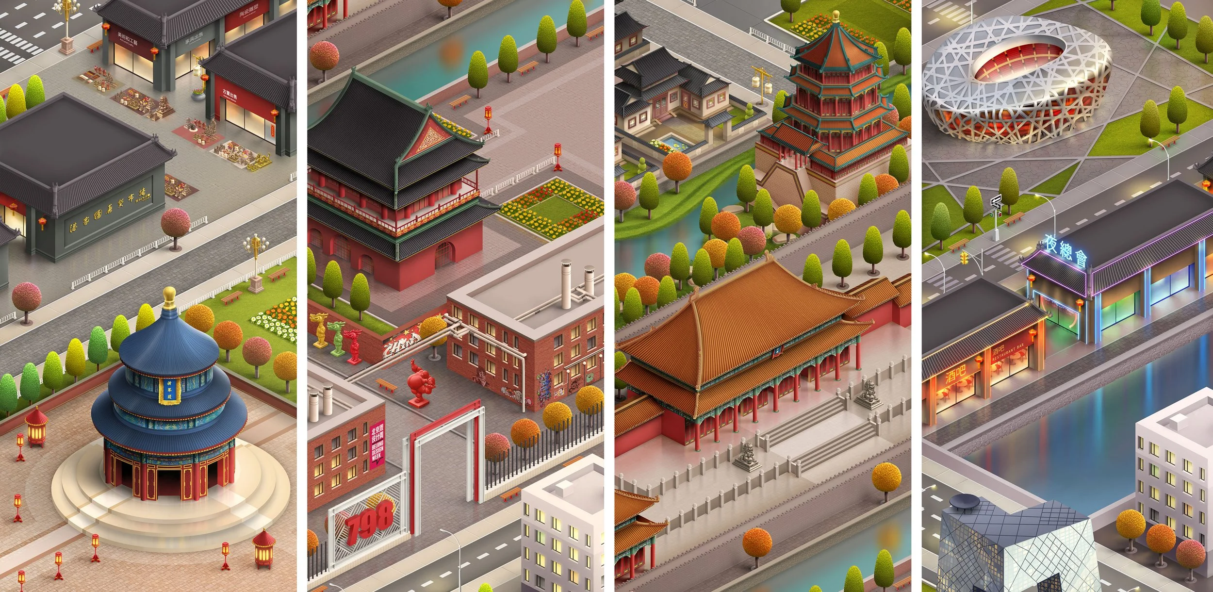 Visual Storytelling: Integrated cultural details and "easter eggs" (like local food stalls, tourists, and specific vegetation) to give each map a unique sense of place.